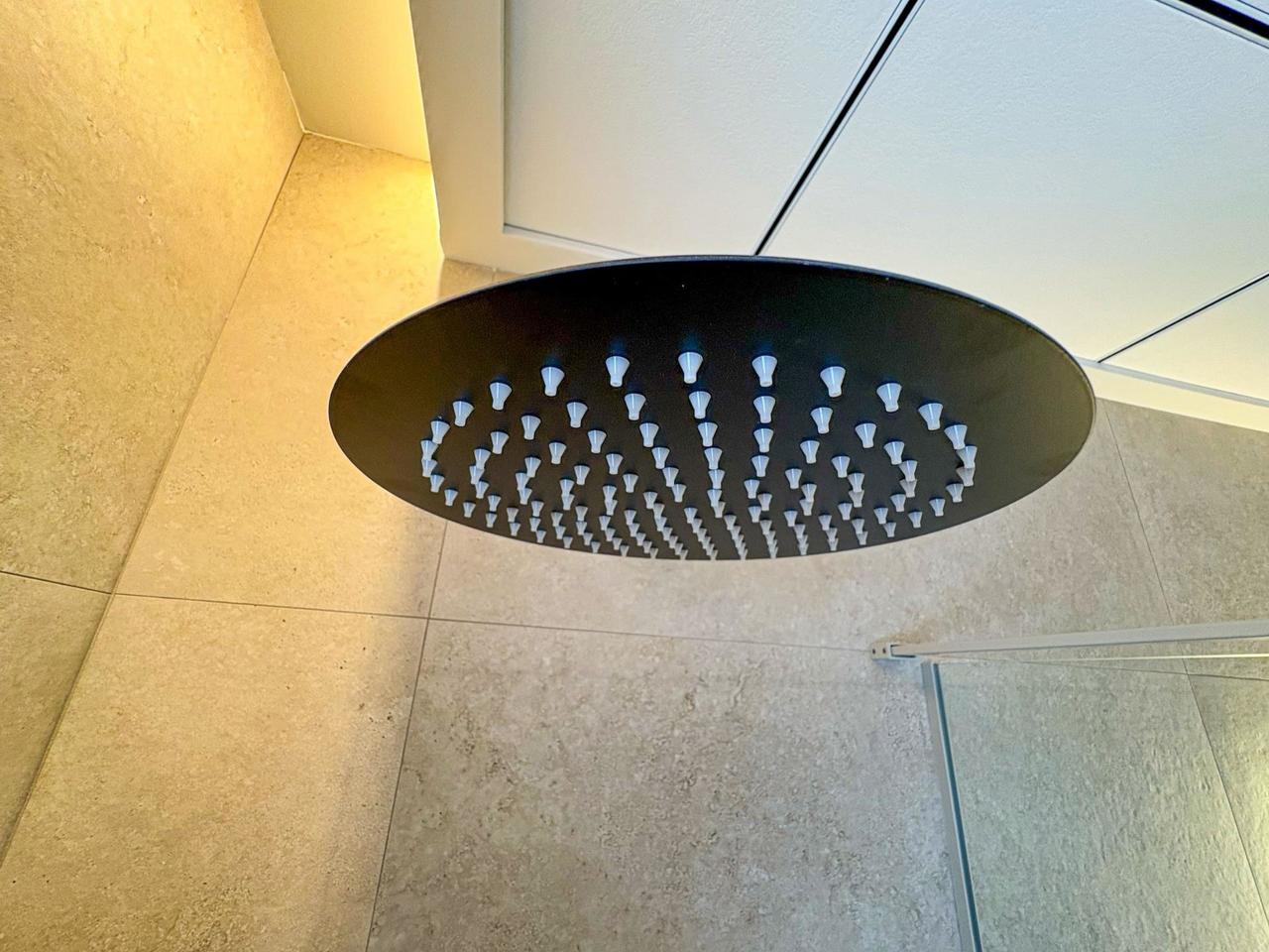 Badrum med möbler, duschväggar och elektriska handdukstorkar